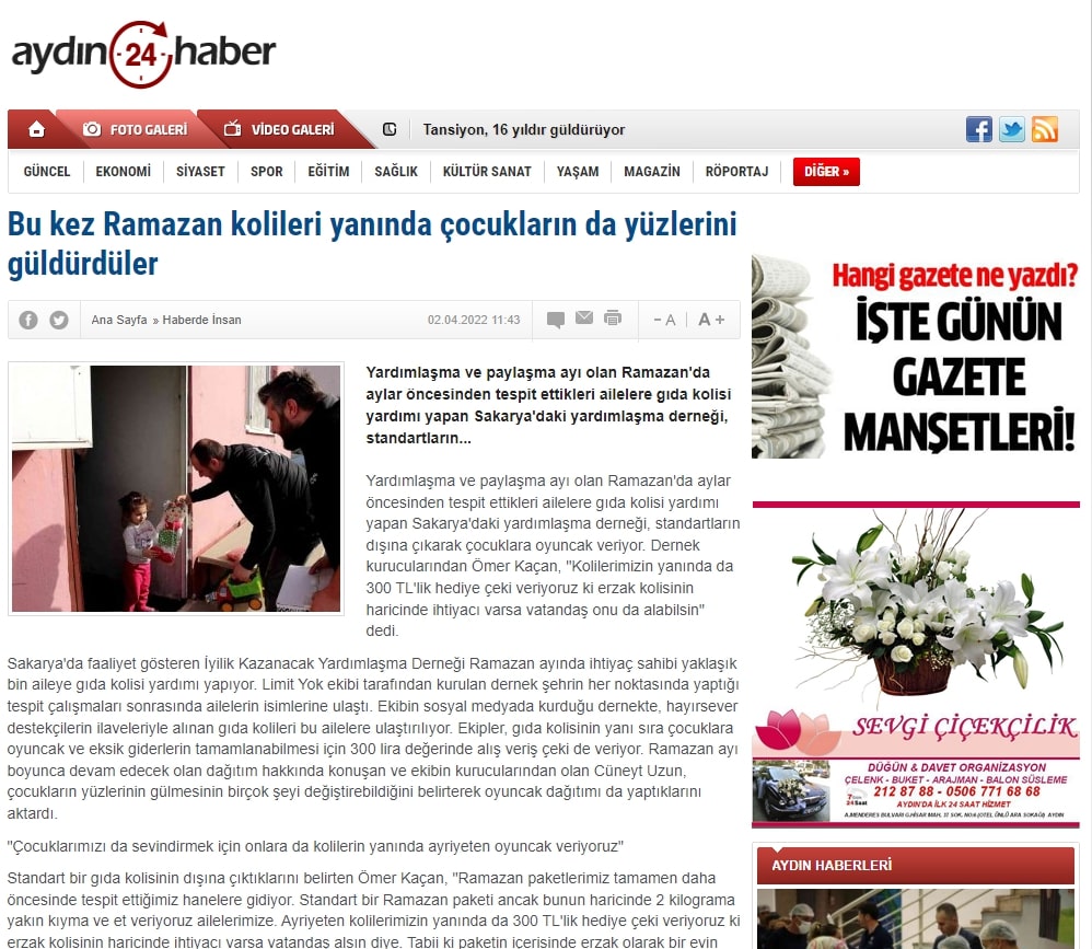 Sakarya'da faaliyet gösteren İyilik Kazanacak Yardımlaşma Derneği Ramazan ayında ihtiyaç sahibi yaklaşık bin aileye gıda kolisi yardımı yapıyor. Limit Yok ekibi tarafından kurulan dernek şehrin her noktasında yaptığı tespit çalışmaları sonrasında ailelerin isimlerine ulaştı. Ekibin sosyal medyada kurduğu dernekte, hayırsever destekçilerin ilaveleriyle alınan gıda kolileri bu ailelere ulaştırılıyor. Ekipler, gıda kolisinin yanı sıra çocuklara oyuncak ve eksik giderlerin tamamlanabilmesi için 300 lira değerinde alış veriş çeki de veriyor. Ramazan ayı boyunca devam edecek olan dağıtım hakkında konuşan ve ekibin kurucularından olan Cüneyt Uzun, çocukların yüzlerinin gülmesinin birçok şeyi değiştirebildiğini belirterek oyuncak dağıtımı da yaptıklarını aktardı.